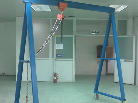 在高度可通過旋鈕調(diào)節(jié)的起重龍門架的工字鋼橫梁之上掛設(shè)手拉葫蘆單軌行車,手拉葫蘆單軌行車可在門式框架的橫梁上做橫向滑動(dòng),以便于在橫向位置上短距離運(yùn)輸設(shè)備零部件。手拉葫蘆作專業(yè)的起重提升設(shè)備用,用于在垂直方向上移動(dòng)設(shè)備零部件等重物。